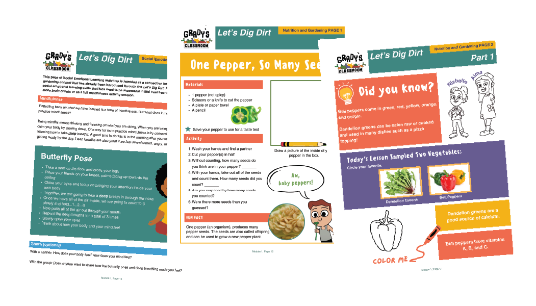 Grady’s Classroom is a 501(c)(3) nonprofit organization that provides research-driven, age-appropriate, purposeful and targeted curriculum (e.g., social emotional learning, nutrition and health, and gardening), and experiential learning extensions, such as vegetable tastings, recipe testing, games, and other activities, to children in often under-resourced areas.